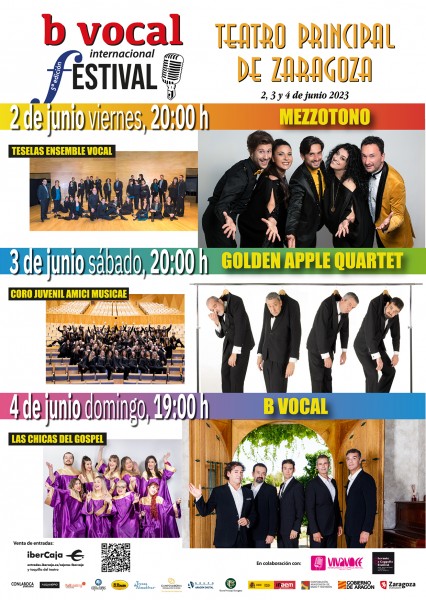 Vuelve el Festival B Vocal a Cappella de Zaragoza. En esta 5ª edición se dan cita el grupo italiano €Mezzotono€, los donostiarras €Golden Apple Quartet€ y 3 grupos locales, Teselas Ensemble Vocal, el Coro Juvenil Amici Musicae y Las Chicas del Gospel. El día 4 cerrará el Festival el grupo anfitrión, B Vocal. Será 3 días intensos de música a cappella en los que la combinación de grupos invitados mostrará la gran variedad de estilos interpretativos de esta disciplina. Música clásica, contemporánea, gospel, pop, etc, llenarán el escenario del Teatro Principal. Las entradas ya están a la venta. No te pierdas este singular festival que sigue su andadura con propuestas cada vez más variadas e interesantes.